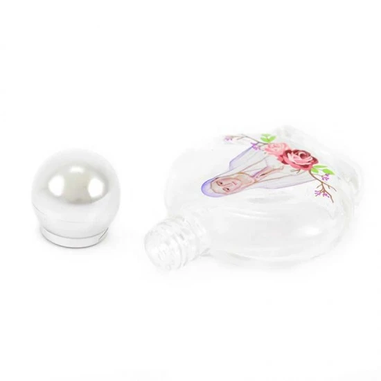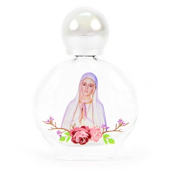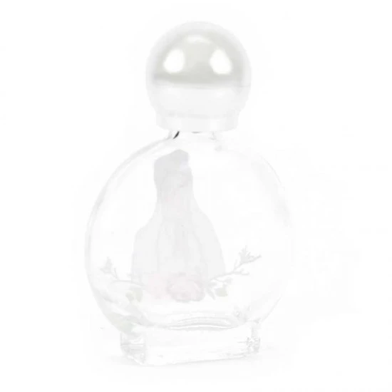 Bottiglietta Madonna di Fatima, realizzata in vetro trasparente con stampa serigrafica, munita di tappo sferico in plastica argentata. Il prodotto si adatta a contenere, olio benedetto, acqua santa, essenze profumate.