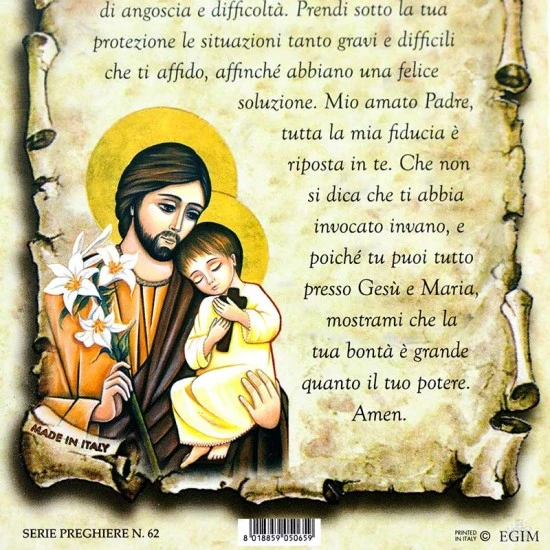 Cartoncino con preghiera “Glorioso Patriarca San Giuseppe” Made in Italy