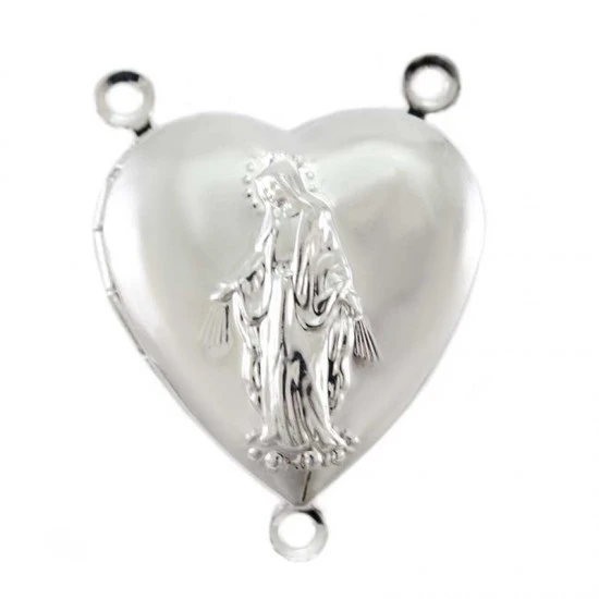 Crociera apribile portafoto adatta per montaggi di rosari. Realizzata in metallo argentato a forma di cuore raffigurante la Madonna Miracolosa a rilievo. Made in Italy