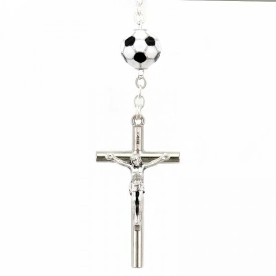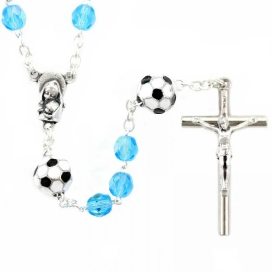 Simpatico il Rosario dello sportivo realizzato con grani tondi in vetro sfaccettato e legati con catenina in metallo. I Pater sono rappresentati da palloni di calcio, crociera e Crocifisso pendente in metallo. Fornito in blister di plastica trasparente contenente oltre che il Rosario un cartoncino con la stampa della preghiera dello sportivo.