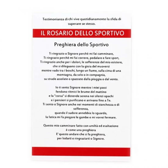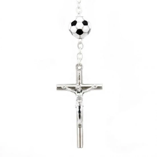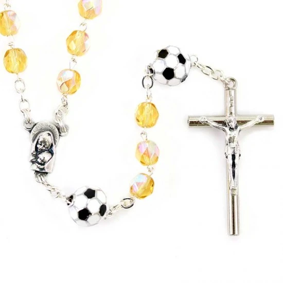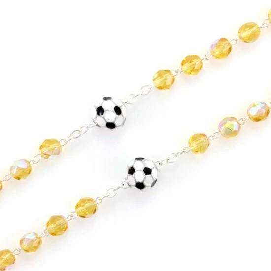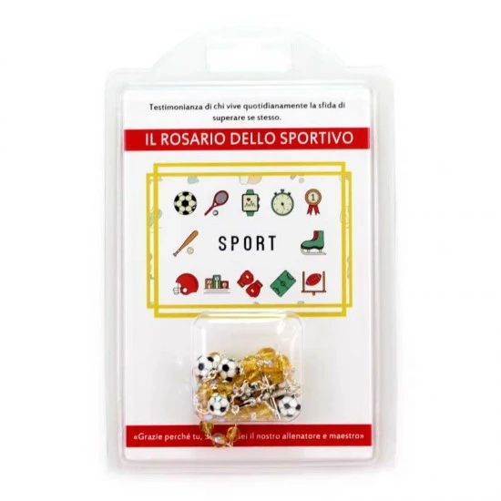 Simpatico il Rosario dello sportivo realizzato con grani tondi in vetro sfaccettato e legati con catenina in metallo. I Pater sono rappresentati da palloni di calcio, crociera e Crocifisso pendente in metallo. Fornito in blister di plastica trasparente contenente oltre che il Rosario un cartoncino con la stampa della preghiera dello sportivo.