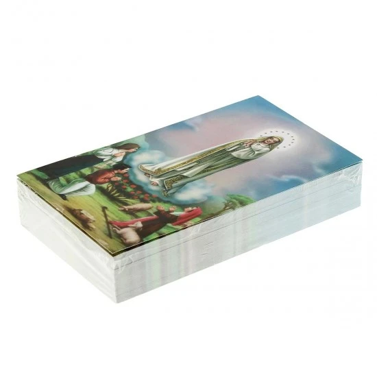 Confezione da 100 immagini della Madonna di Fatima con pastorelli in cartoncino. Il retro dell’immagine è senza scritta. Made in Italy