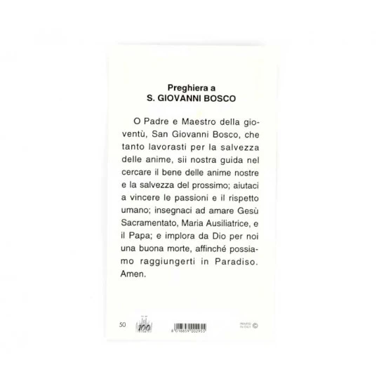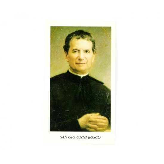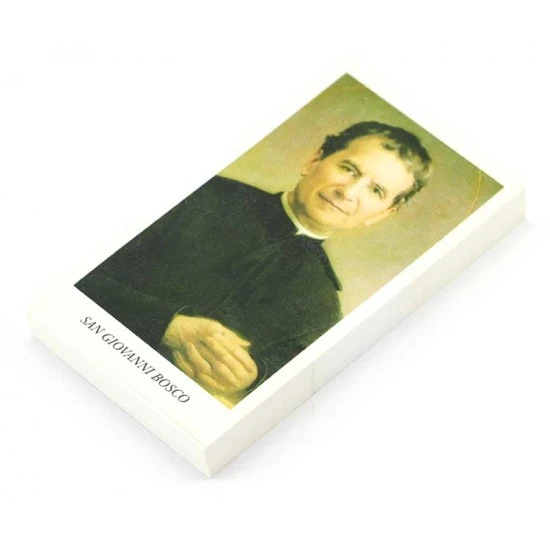 Confezione da 100 santini immagine di San Giovanni Bosco in carta semplice con retro preghiera. Made in italy.