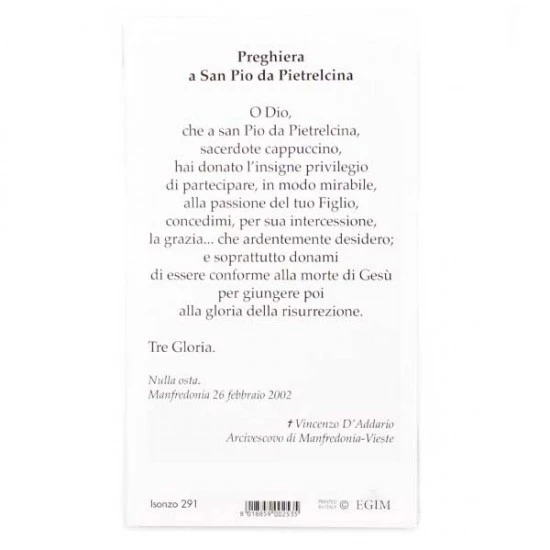 Confezione da 100 santini immagine San Pio da Pietrelcina in carta semplice con preghiera sul retro. Made in Italy