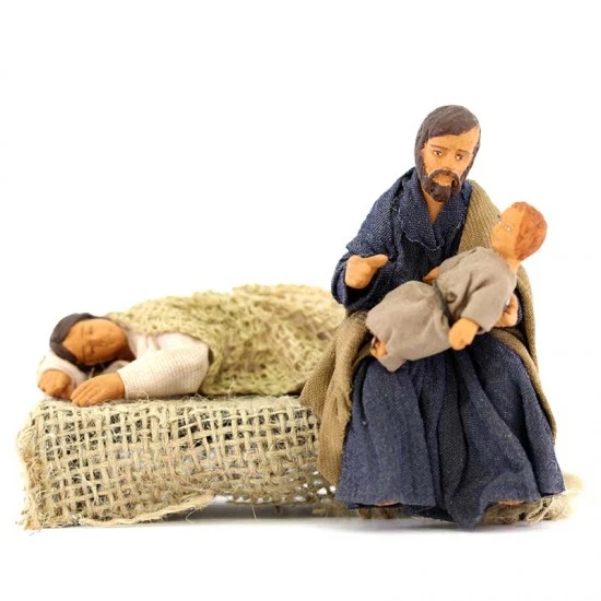 Scena Madonna che dorme e San Giuseppe con Gesù in braccio in terracotta vestita, statuine realizzate in vera terracotta dipinta a mano e successivamente vestite con stoffa modellata sul pezzo da esperti artigiani che curano nel dettaglio ogni minimo particolare. Made in Italy