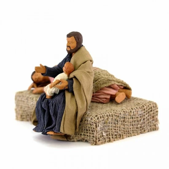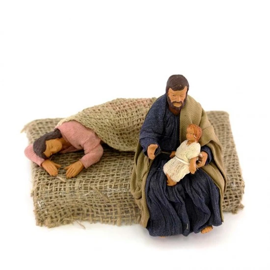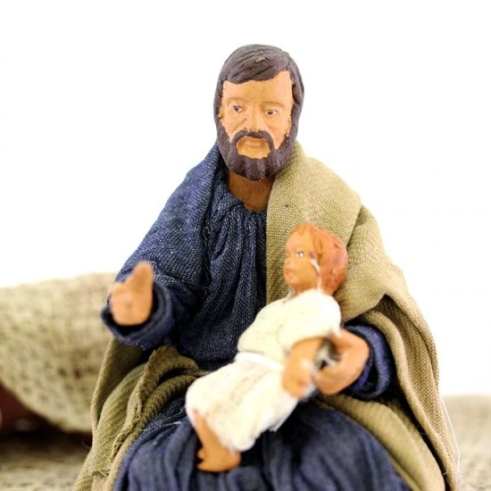 Scena Madonna che dorme e San Giuseppe con Gesù in braccio in terracotta vestita, statuine realizzate in vera terracotta dipinta a mano e successivamente vestite con stoffa modellata sul pezzo da esperti artigiani che curano nel dettaglio ogni minimo particolare. Made in Italy