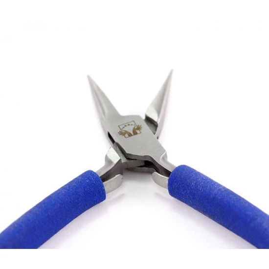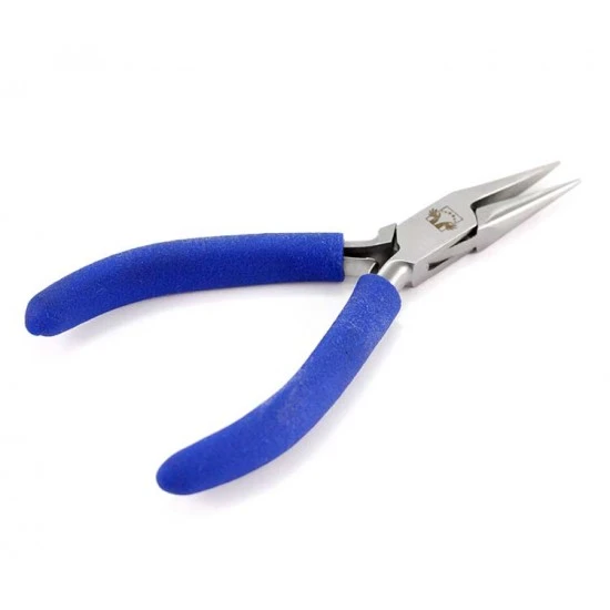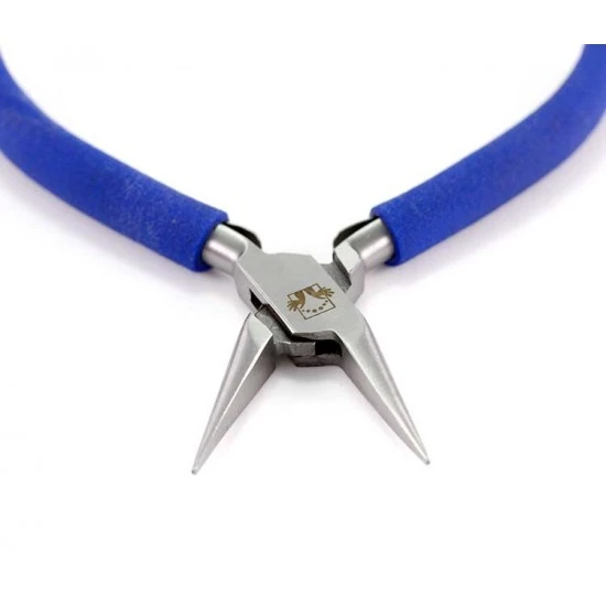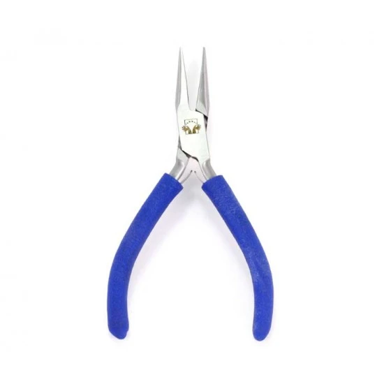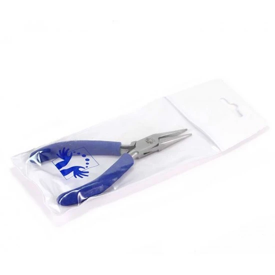 Pinza realizzata con manici di colore blu con punte piatte fini, adatta per montaggi di rosari, bracciali, decine, eccetera eccetera. Fornita completa di bustina in plastica trasparente.