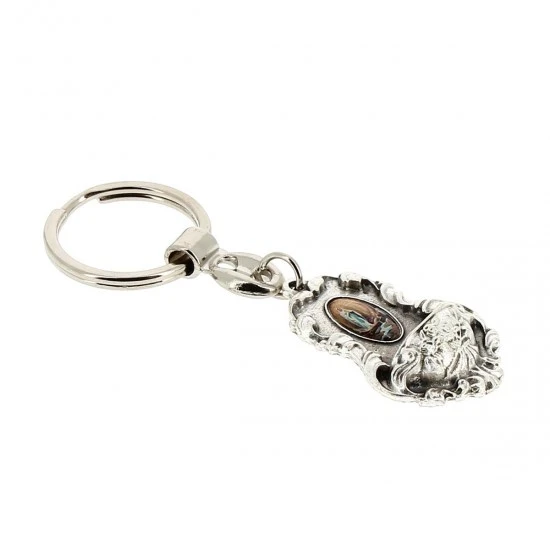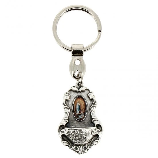 Portachiavi acquasantiera realizzato in metallo argentato antichizzato con resina colorata raffigurante l’immagine della Madonna di Lourdes. Il portachiavi è munito di gancio ad anello molto resistente. Made in Italy