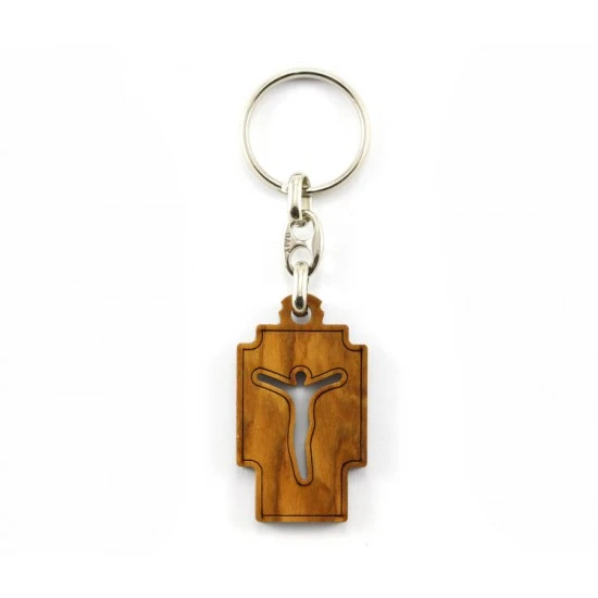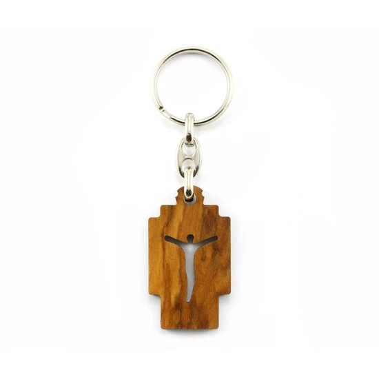 Portachiavi Cristo traforato rettangolare in ulivo, munito di gancio ad anello. Confezionato in bustina di plastica trasparente. Made in Italy