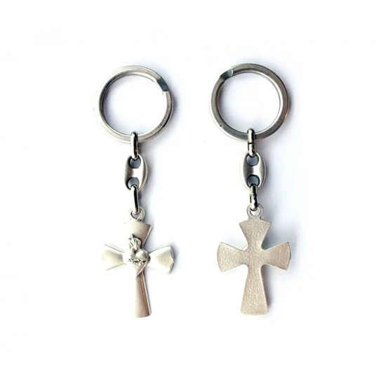 Portachiavi Croce con cuore con cuore realizzato in metallo argentato ossidato, munito di gancio ad anello. Made in Italy