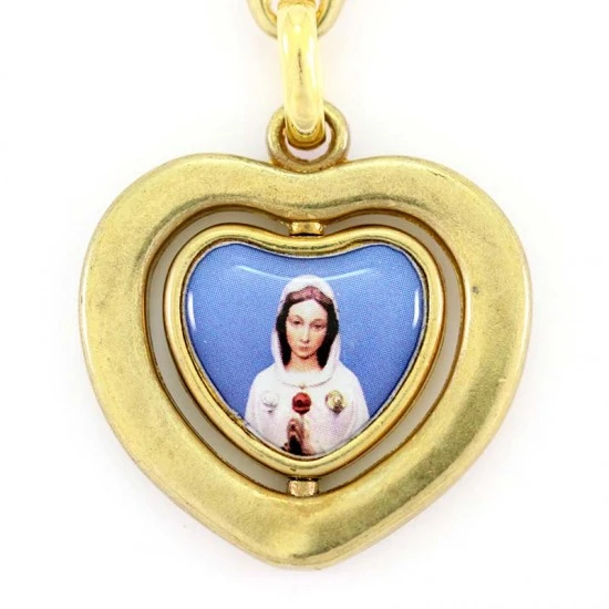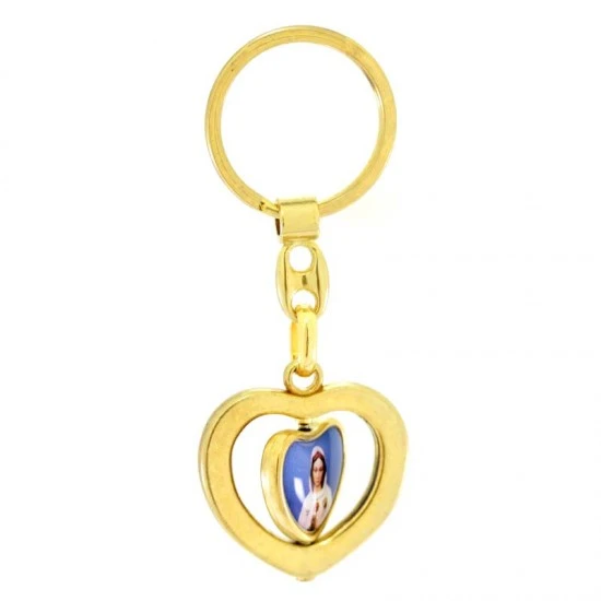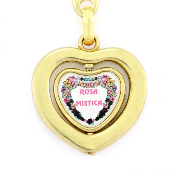 Portachiavi in metallo dorato a forma di cuore con interno girevole e raffigurazione della Madonna Rosa Mistica realizzata su resinato colorato. Il portachiavi è munito di gancio ad anello molto resistente ed è fornito in bustina di plastica trasparente. Made in Italy