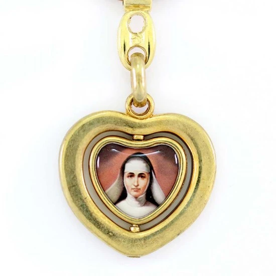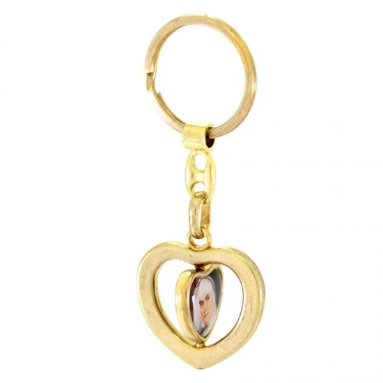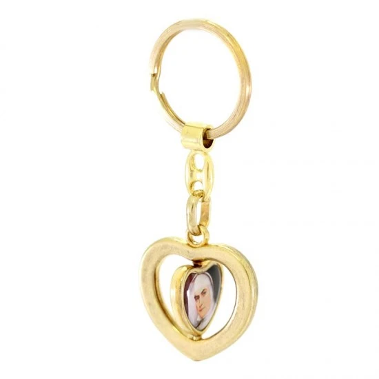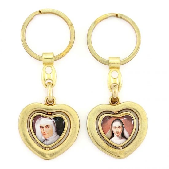 Portachiavi in metallo dorato a forma di cuore con interno girevole e raffigurazione di Santa Giovanna Antida Thouret e Santa Faustina realizzate su resinato colorato. Il portachiavi è munito di gancio ad anello molto resistente ed è fornito in bustina di plastica trasparente. Made in Italy
