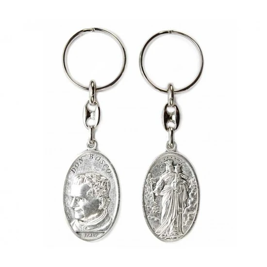 Portachiavi ovale in metallo argentato con raffigurazione di Don Bosco da un lato e Maria Ausiliatrice dall’altro, gancio ad anello. Made in Italy
