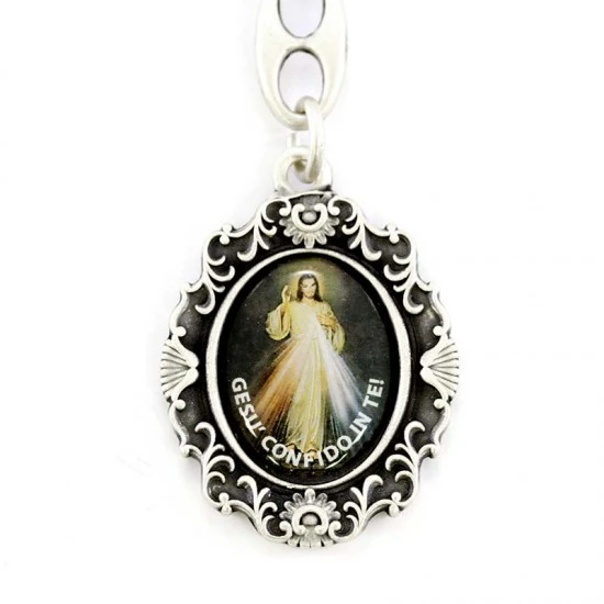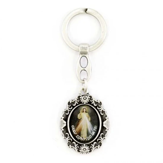 Portachiavi Gesù Misericordioso realizzato in metallo argentato nikel e resinato colorato, munito di gancio ad anello. Made in Italy