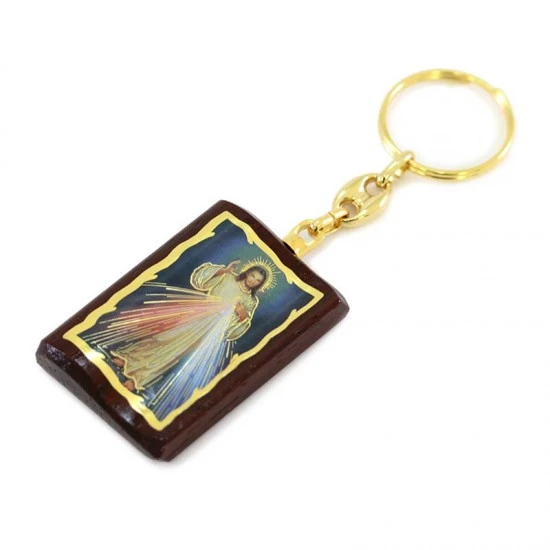 Portachiavi rettangolare in legno con gancio ad anello dorato con immagine di Gesù Misericordioso a colori foglia oro. Confezionato in bustina di plastica trasparente. Made in Italy