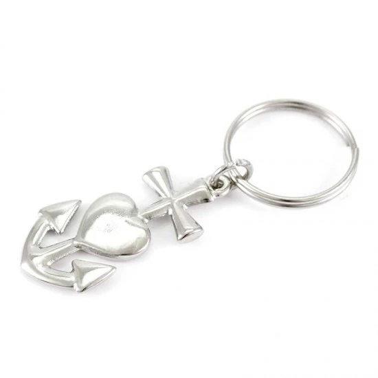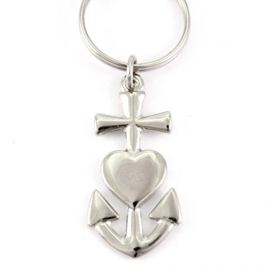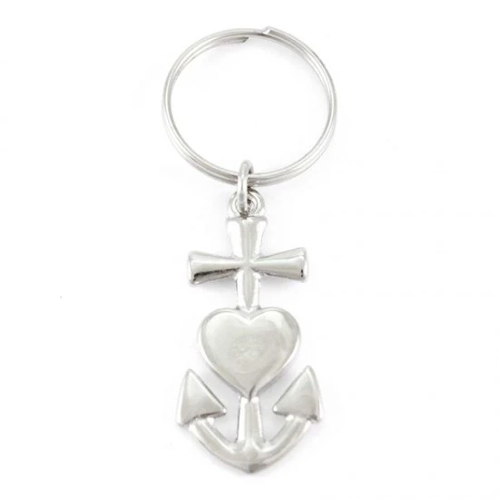 Portachiavi realizzato interamente in metallo argentato nichelato raffigurante i simboli delle tre virtù teologali Fede, Speranza e Carità. Il portachiavi è munito di gancio ad anello molto resistente. Made in Italy