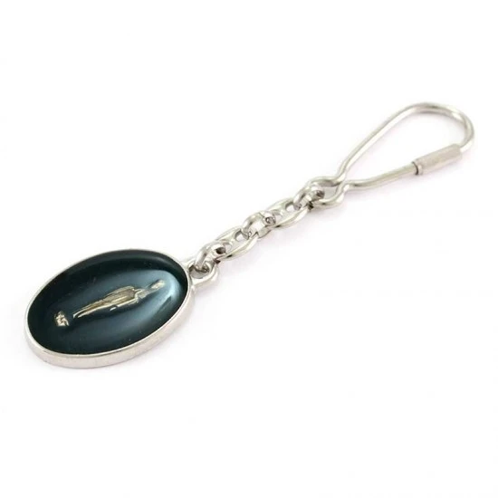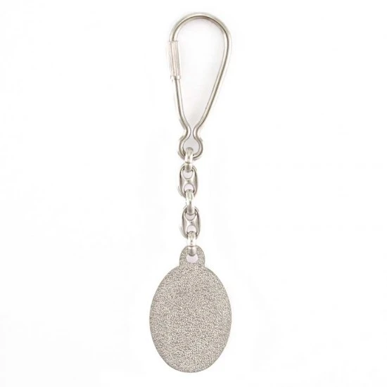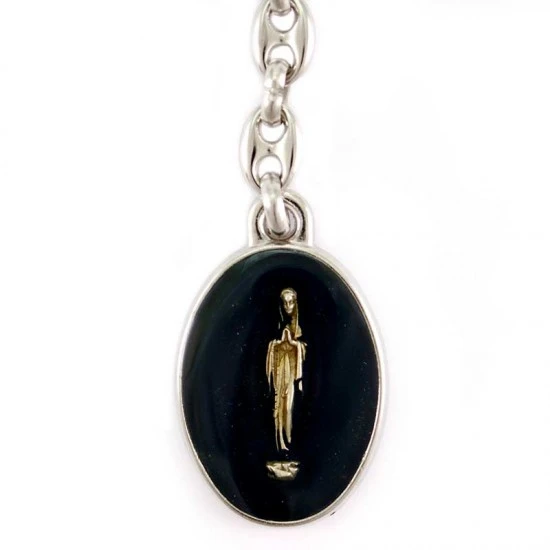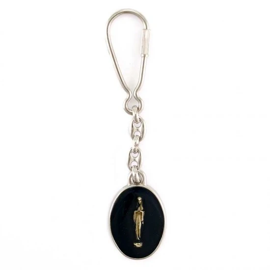 Portachiavi ovale raffigurante la Madonna di Lourdes realizzato in metallo con fondo di colore blu e munito di gancio con chiusura a vite molto resistente. Made in Italy