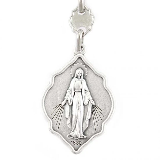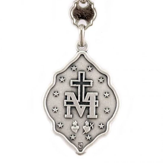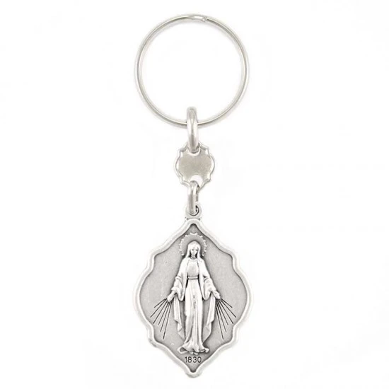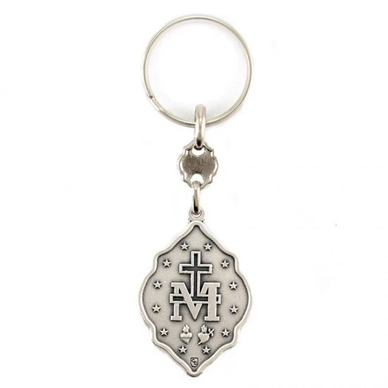 Portachiavi Madonna Miracolosa con Monogramma Mariano sul retro realizzato interamente in metallo argentato e munito di gancio ad anello molto resistente. Fornito in bustina di plastica trasparente. Made in Italy