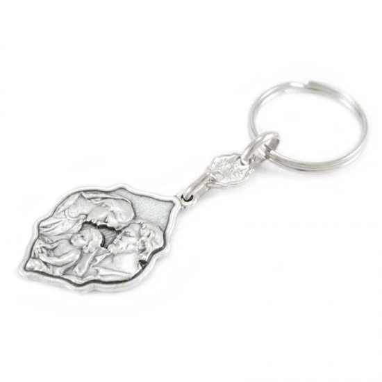 Portachiavi Sacra Famiglia realizzato interamente in metallo argentato e munito di gancio ad anello molto resistente. Fornito in bustina di plastica trasparente. Made in Italy