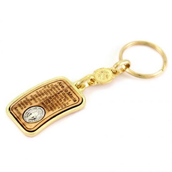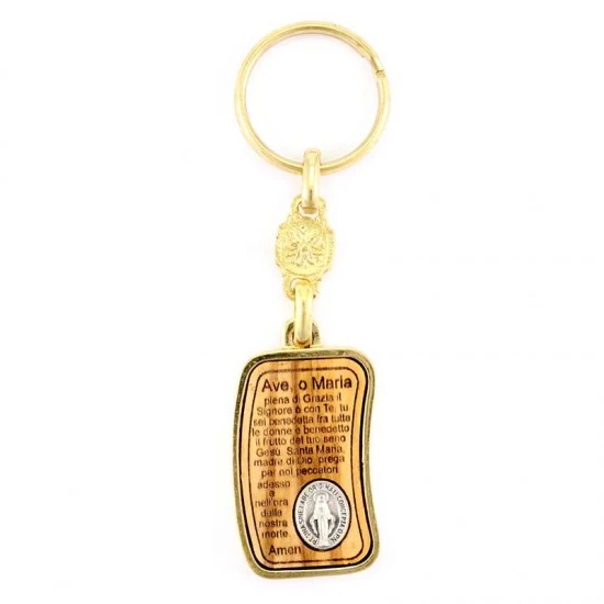 Portachiavi Madonna Miracolosa con Ave Maria, realizzato in metallo dorato con pergamena in legno di ulivo incastrata, con sopra incisa la preghiera. La medaglia della Madonna è visibile anche nel retro. Il portachiavi è munito di gancio ad anello e confezionato in bustina di plastica trasparente. Made in Italy