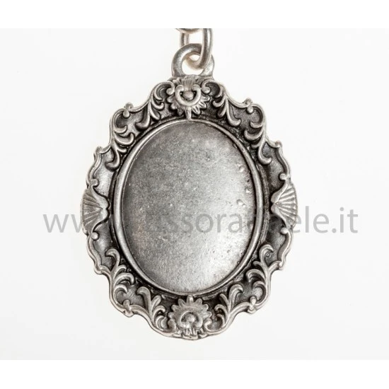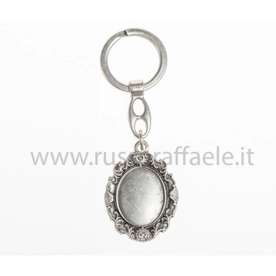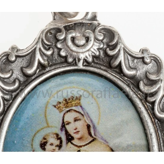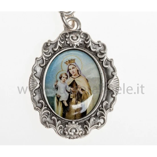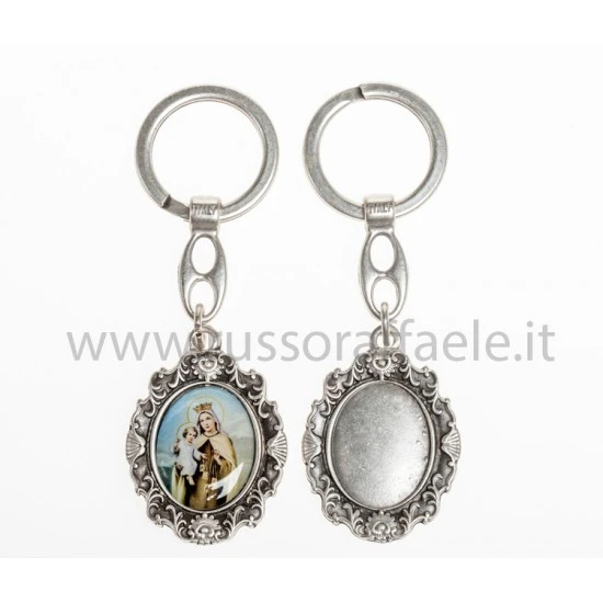 Portachiavi Madonna del Carmine realizzato in metallo argentato nikel e resinato colorato, munito di gancio ad anello. Made in Italy