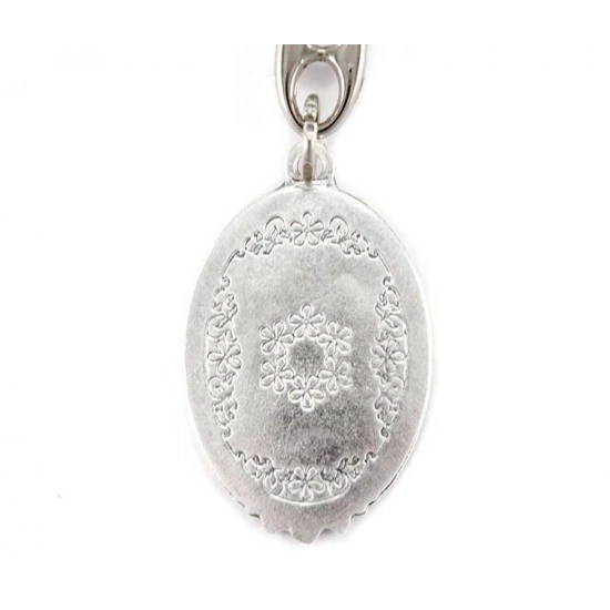 Portachiavi Madonna del Carmine realizzato in metallo argentato ovale nikelato con resinato a colori. Made in Italy
