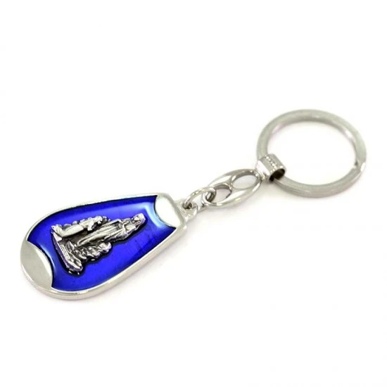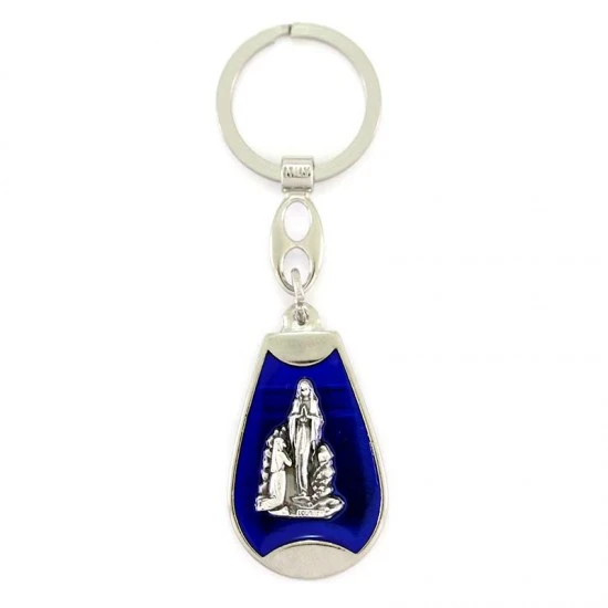 Portachiavi Madonna di Lourdes a forma di goccia, realizzato in metallo argentato e smalto blu con placca in metallo raffigurante la Madonna. Sul retro è incisa una rosa ed è presente una miniatura in resina colorata raffigurante San Cristoforo. Il portachiavi è munito di gancio ad anello molto resistente. Made in Italy