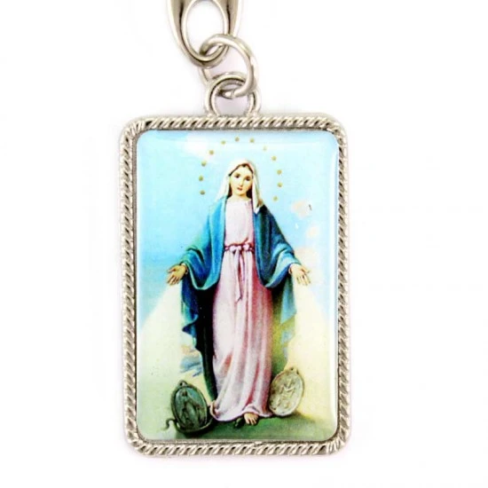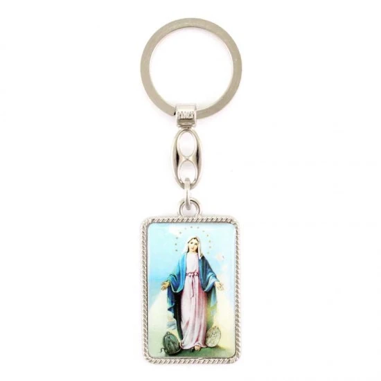 Portachiavi Madonna Miracolosa realizzato in metallo argentato nichelato con resina colorata su entrambi i lati raffigurante la Madonna e lo stemma Mariano. Il portachiavi è munito di gancio ad anello molto resistente. Made in Italy