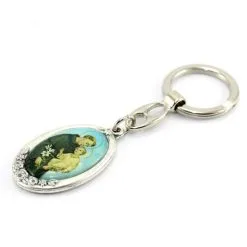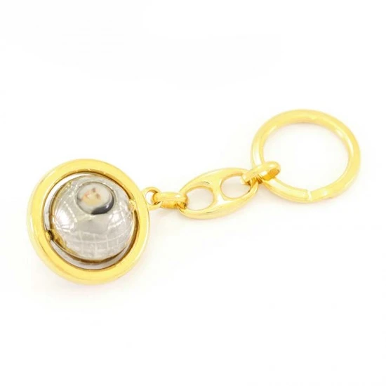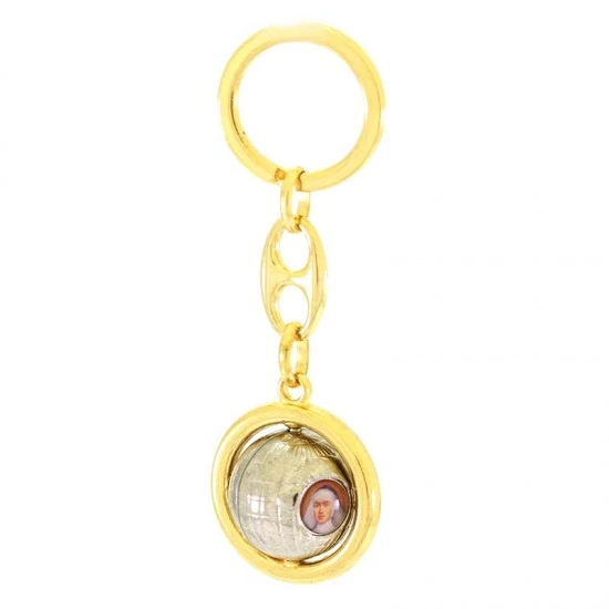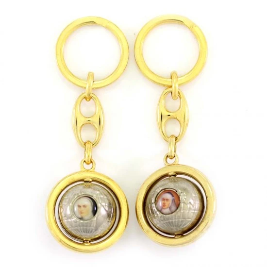 Portachiavi Mappamondo girevole realizzato in metallo bicolore, gancio e catena dorato e sfera argentata, arricchito da due resine colorate raffiguranti Santa Faustina e Santa Giovanna Antida Thouret. Il portachiavi è munito di gancio ad anello molto resistente. Made in Italy