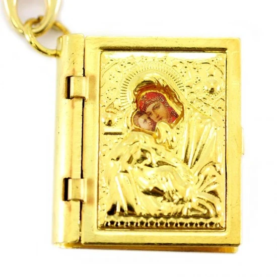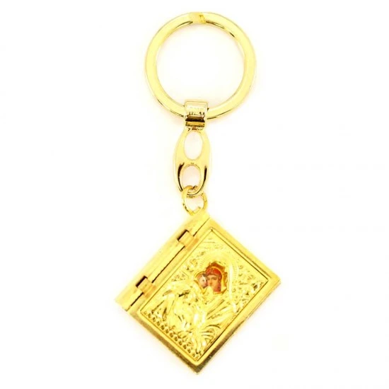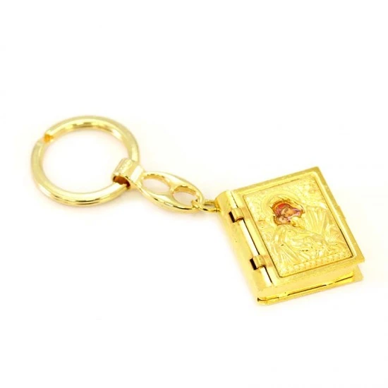 Portachiavi Libro apribile realizzato in metallo dorato raffigurante la Madonna con Bambino. Arricchito da mini Rosario in plastica posto all’interno del libro. Il portachiavi è munito di gancio ad anello molto resistente. Made in Italy