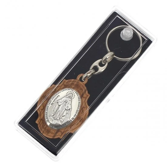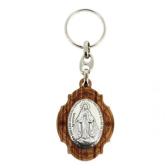 Portachiavi Madonna Miracolosa bilaminato argento su legno di ulivo con gancio ad anello molto resistente. Fornito confezionato con scatola rigida in plastica trasparente contenente certificato di garanzia. Made in Italy