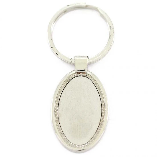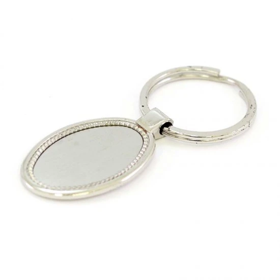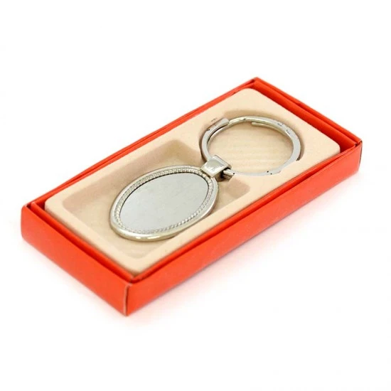Portachiavi ovale realizzato interamente in metallo nichelato, munito di gancio ad anello molto resistente. Fornito in elegante scatola sagomata in cartone rosso.