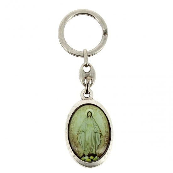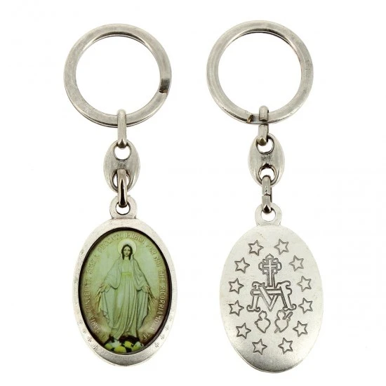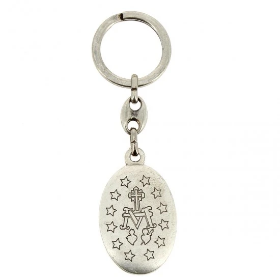 Portachiavi Madonna Miracolosa realizzato in metallo ovale argentato antichizzato con resina colorata raffigurante l’immagine della Madonna. Sul retro sono incise 12 stelle e il simbolo Mariano. Il portachiavi è munito di gancio ad anello molto resistente. Made in Italy