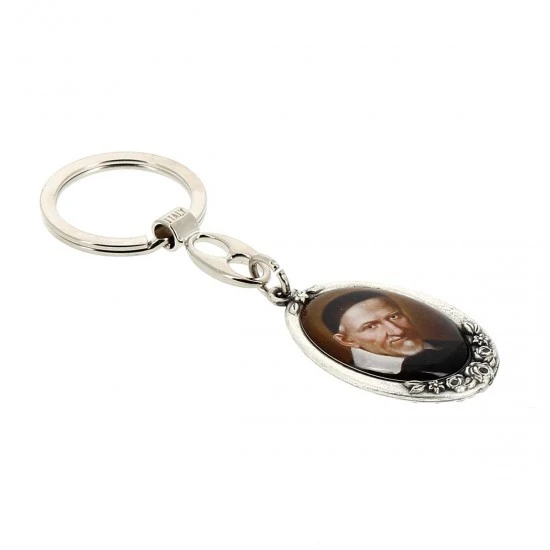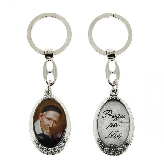 Portachiavi San Vincenzo de Paoli realizzato in metallo ovale argentato antichizzato con resina colorata raffigurante l’immagine del Santo. Sul retro è inciso la scritta “Prega per noi”, il portachiavi è munito di gancio ad anello molto resistente. Made in Italy