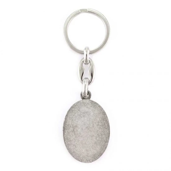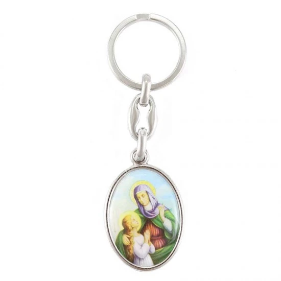 Portachiavi Sant’Anna realizzato in metallo argentato nichelato di forma ovale con resinato colorato, munito di gancio ad anello molto resistente. Made in Italy