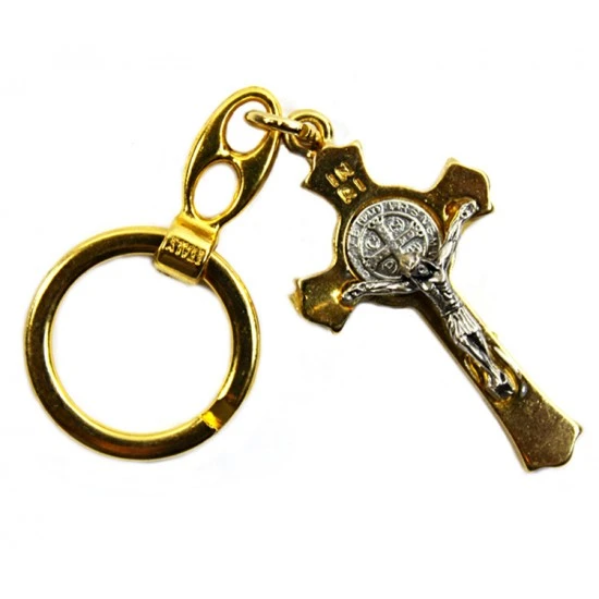 Portachiavi di San Benedetto realizzato in metallo dorato con corpo di Gesù e Medaglia argento ossidato, munito di gancio ad anello resistente. Made in Italy