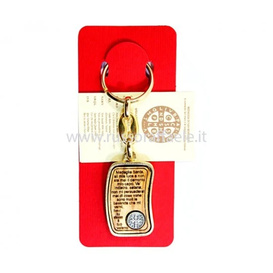 Portachiavi San Benedetto realizzato in metallo dorato con pergamena in legno di ulivo con sopra incisa la preghiera e incastrata, la medaglia del Santo visibile anche nel retro. Munito di gancio ad anello. Confezionato in bustina di plastica trasparente su cartoncino rosso. Made in Italy