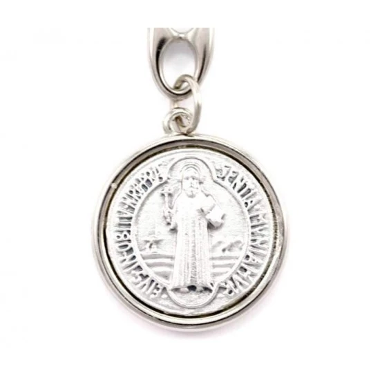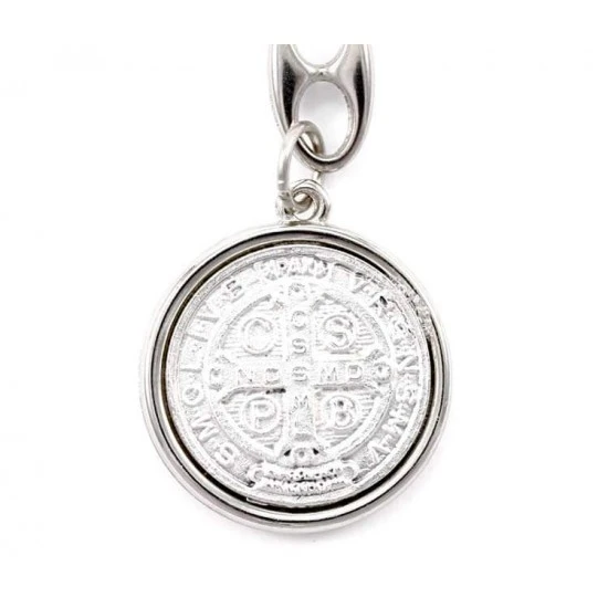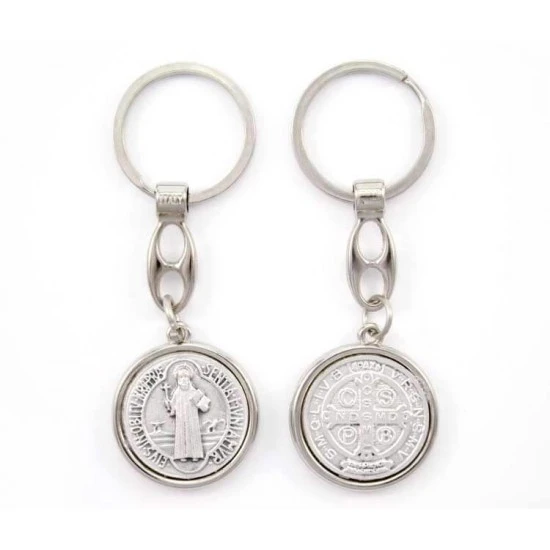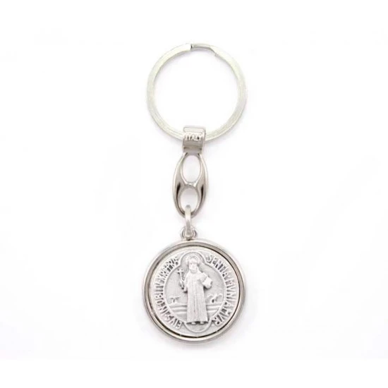 Portachiavi San Benedetto realizzato interamente in metallo argentato e munito di gancio ad anello molto resistente. Made in Italy