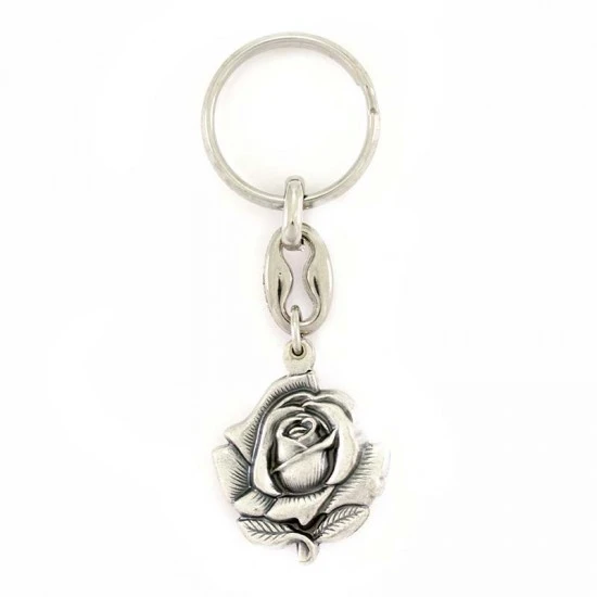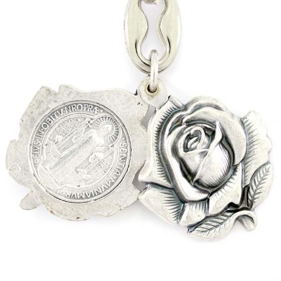 Portachiavi San Benedetto realizzato in metallo argentato a forma di rosa che si apre con internamente la classica medaglia del santo, munito di gancio ad anello nichelato. Made in Italy