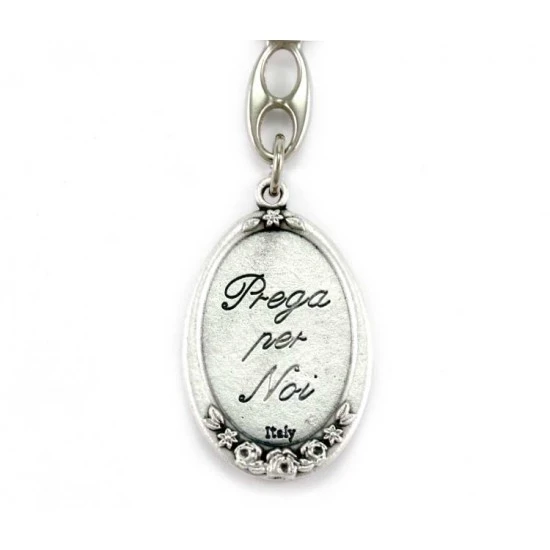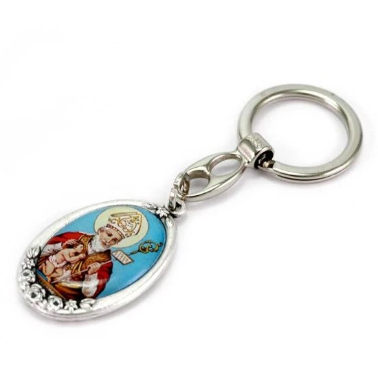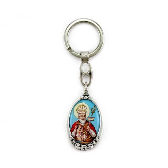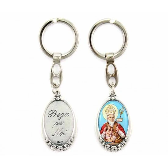 Portachiavi San Biagio realizzato in metallo ovale argentato antichizzato con resinato colorato, munito di gancio ad anello. Made in Italy