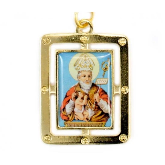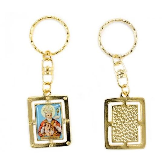 Portachiavi San Biagio rettangolare realizzato in metallo dorato e resinato colorato, munito di gancio ad anello. Made in Italy