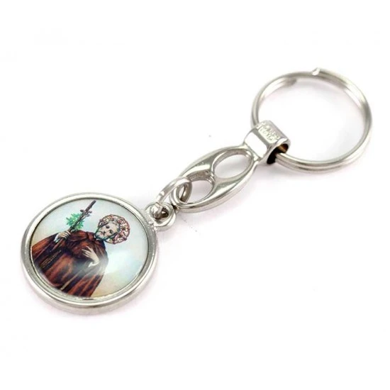 Portachiavi San Ciro tondo realizzato in metallo argentato nikel e resinato a colori, munito di gancio ad anello. Made in Italy
