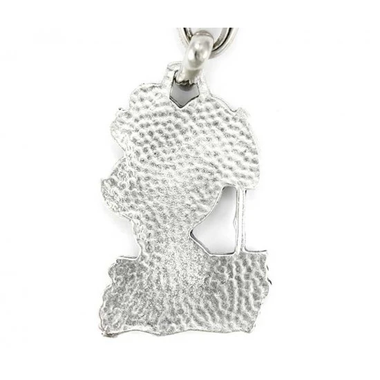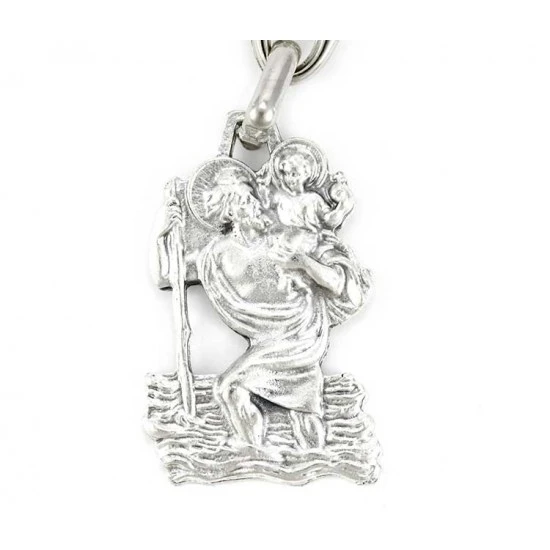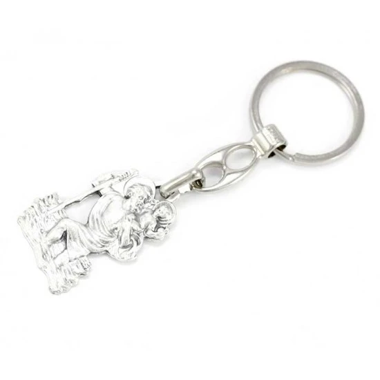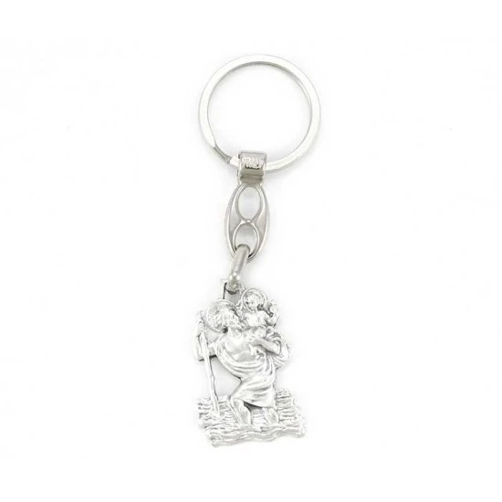 Portachiavi a forma di statuina di San Cristoforo in metallo argentato ossidato, munito di gancio ad anello. Made in Italy