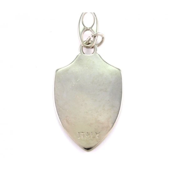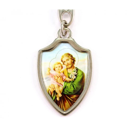 Portachiavi scudo San Giuseppe realizzato in metallo argentato nichelato con resinato colorato, munito di gancio ad anello solido e sicuro. Made in Italy