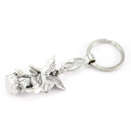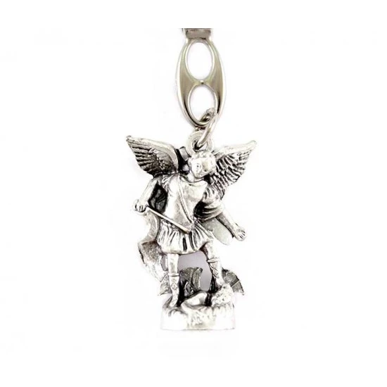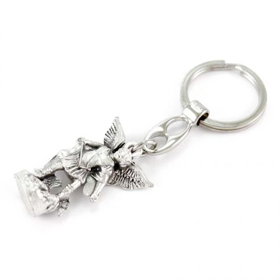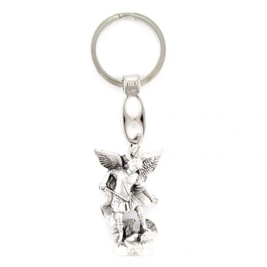 Portachiavi statuina San Michele Arcangelo, realizzato interamente in metallo argentato e munito di gancio ad anello molto resistente. Made in Italy