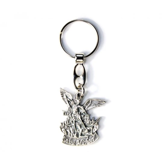 Portachiavi San Michele Arcangelo in metallo argentato ossidato con gancio ad anello. Made in Italy