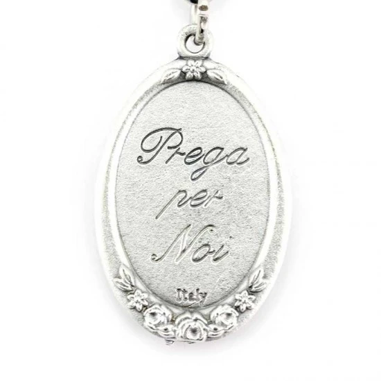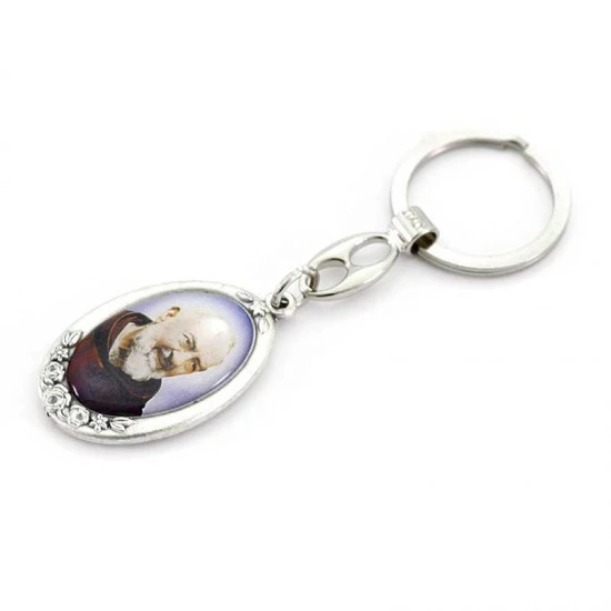 Portachiavi San Pio realizzato in metallo ovale argentato antichizzato con resina colorata raffigurante l’immagine del Santo. Sul retro è inciso la scritta “Prega per noi”, il portachiavi è munito di gancio ad anello molto resistente. Made in Italy