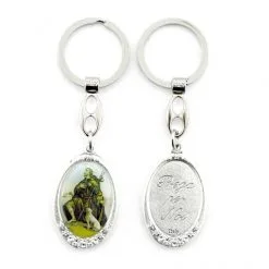Portachiavi San Rocco realizzato in metallo ovale argentato antichizzato con resina colorata raffigurante l’immagine del Santo. Sul retro è inciso la scritta “Prega per noi”, il portachiavi è munito di gancio ad anello molto resistente. Made in Italy