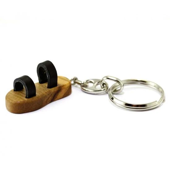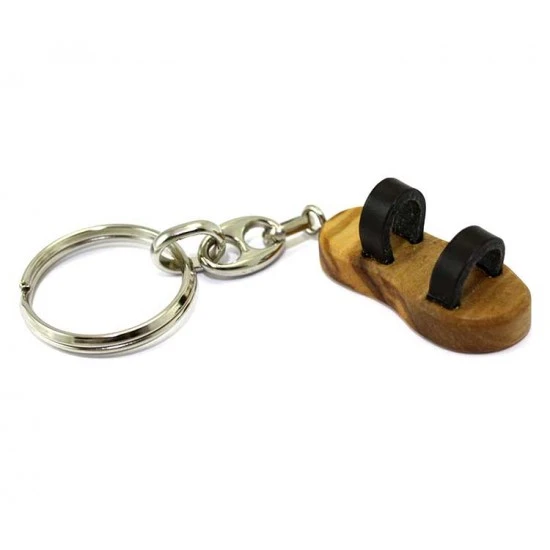 Portachiavi Sandalo Francescano realizzato in legno di ulivo con fascetta in pelle, munito di gancio ad anello. Made in Italy