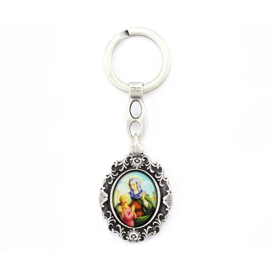 Portachiavi Sant’Anna realizzato in metallo argentato nikel e resinato colorato, munito di gancio ad anello. Made in Italy
